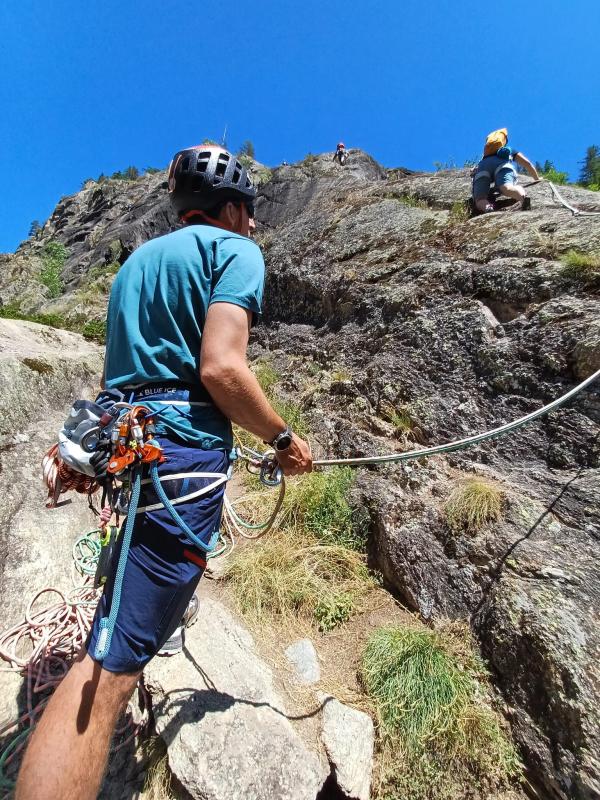 Comme indiqué dans le topo, une voie bien équipée et l'une des plus commodes d'Ailefroide. Forte de cette réputation, d'autres cordées étaient déjà présentes dans la voie. Simon a proposé de nous organiser en 3 cordées de 2, la progression est efficace et fluide entre nous et nous parcourons la voie en réversible. C'est le plaisir de grimper sur le granite d'Ailefroide. A noter, en deuxième longueur pour nous, le petit mur raide suivi d'une traversée en dalle sur la gauche. La fissure de départ de la longueur suivante, en dülfer ou en verrous selon les goûts de chacun. Plus loin, la longueur avec le petit pas final délicat en dalle. Nous terminons la journée devant un verre et à manger à une terrasse d'Ailefroide. Merci Simon pour cette belle journée !