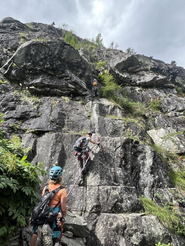 Tout le groupe a bien grimpé, petit casse croûte au sommet puis redescente par le sentier escarpé jusqu'au camping.