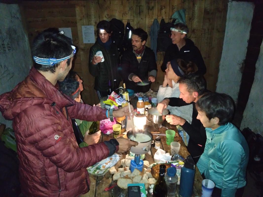 Nuit claire avec la pleine lune. Une odeur de fromage pour s'endormir. Un peu de vent en matinée pour la grimpe puis soleil pour la redescente.