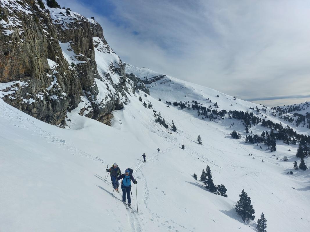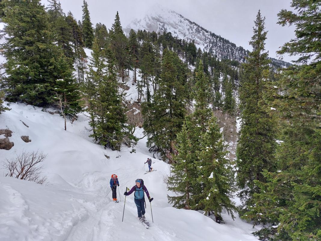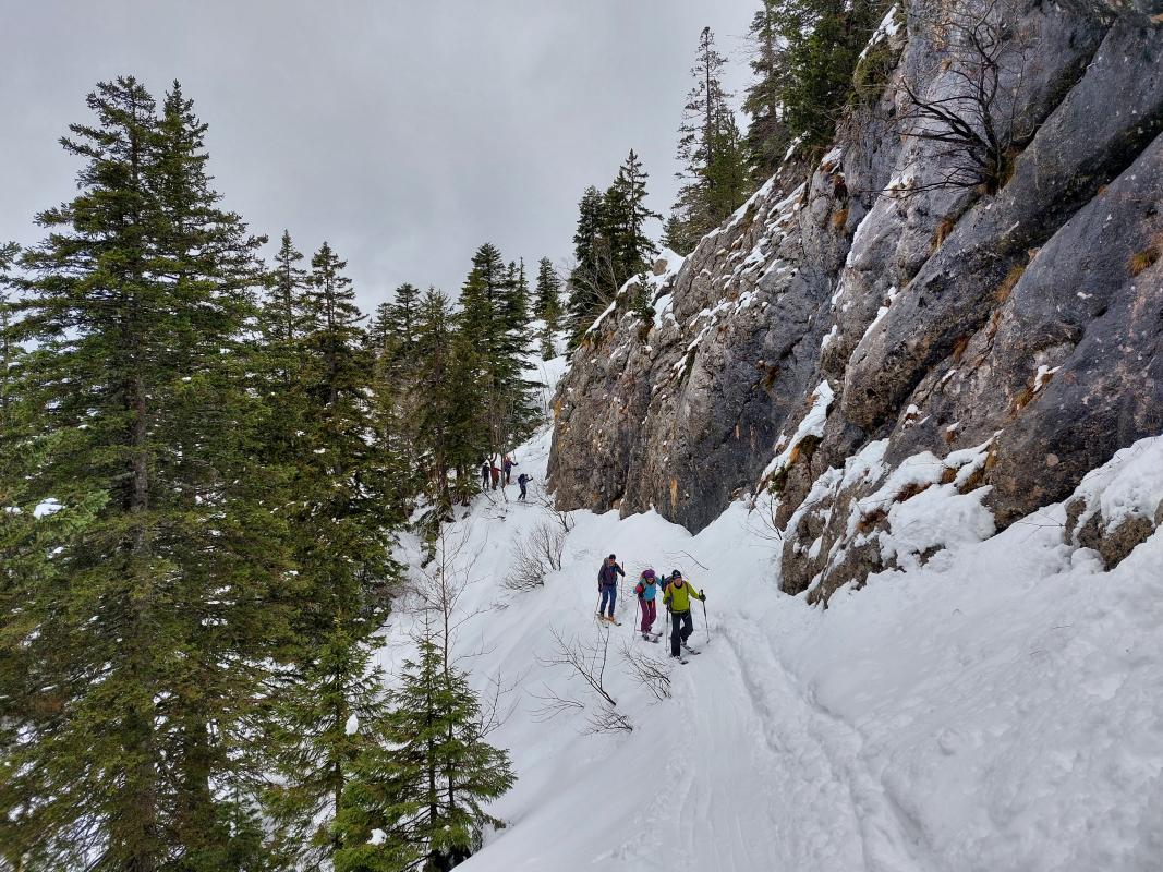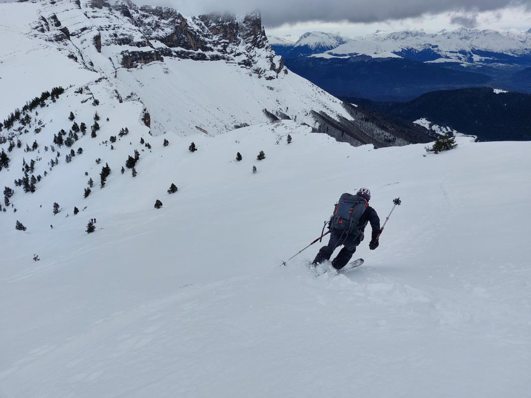 Le secteur est globalement bien enneigé au dessus de 1550 m et la piste forestière du bas passait malgré le redoux. Pour la descente neige poudreuse lourde mais assez agréable à skier.