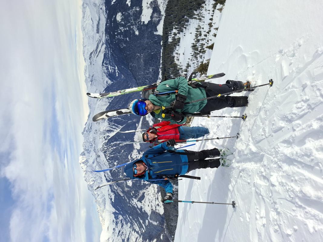 Nous finissons à pied la crête final toujours aussi esthétique dans une petite ambiance alpinisme. Le programme est de poursuivre l'arête pour trouver une pente accueillante mais le jour blanc nous enveloppe. La pente idoine trouvée nous nous engageons prudemment puis retrouvons à la fois et le soleil et la bonne neige.