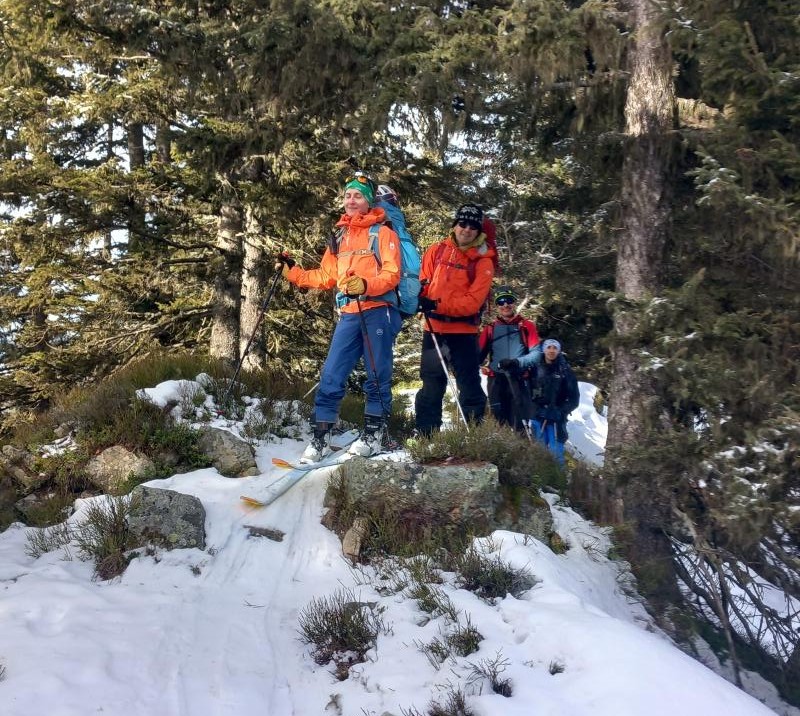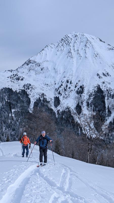 Apres une nuit sonore pour certains (merci Sandy) 🫣, au petit matin c'est une petite trentaine de centimètres qui nous fait de l'œil au niveau du refuge. Les cuisses fourmillent et après un bon peti dej (Cécile nous a régalé d'un gâteau 🍩 et de buiscuit🍪l) la troupe s'élance vers le col ou le réseau ☎️ nous permet de consulter le BERA. Un rapide mais efficace échange au sein du groupe 👍 se solde par le choix de la prudence. Nous renonçons au sommet du petit Charnier🗻 et sa pente Est, pour la crête des Plagnes et ses combes nord-est moins élevées et moins raides. En gravissant la crête, chacun s'amuse à repérer les traces de la nuit, lagopède et lièvre principalement... 2 descentes,1 remontée et quelques indices de cerf 🫎 plus tard, nous regagnons le refuge, grisés par nos exploits! Casse-croûte, paquetage, rangement et nettoyage du refuge🧹🧽, nous voilà prêt pour regagner le parking après une remontée vers la crête et les pistes/hors-piste de la station. Un dernier verre au bistrot🍻 pour pour se dire au revoir et c'est le retour vers Grenoble 🚓🚙.
