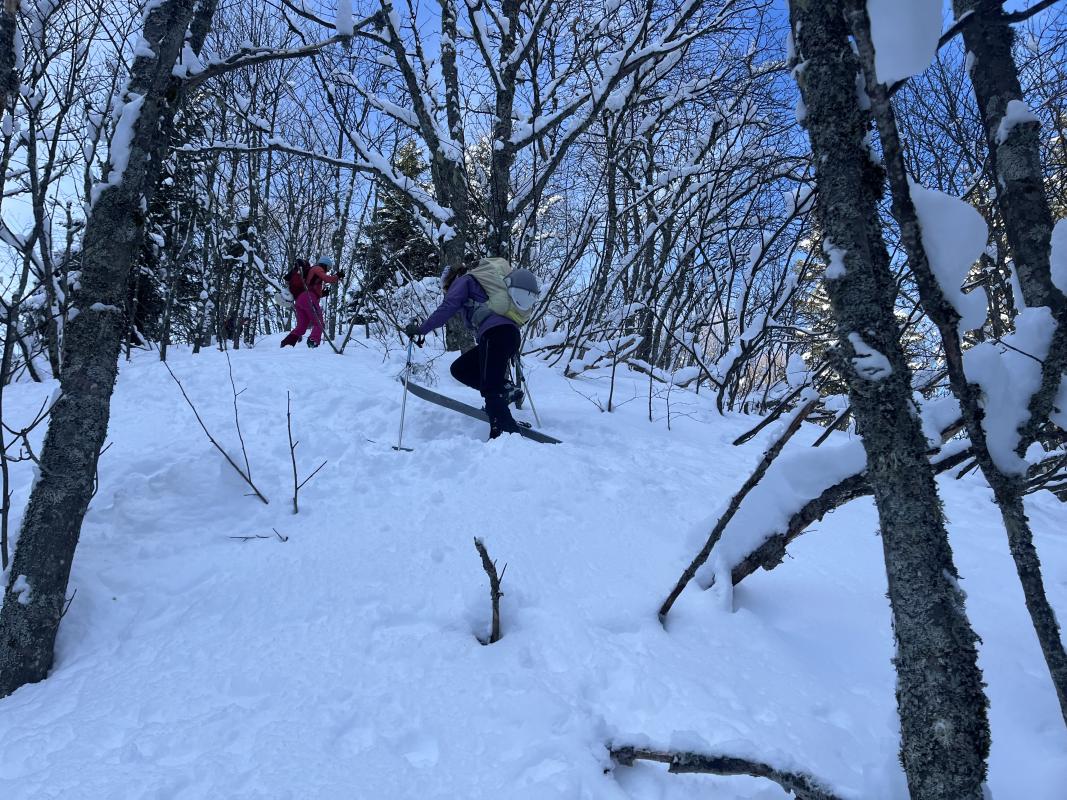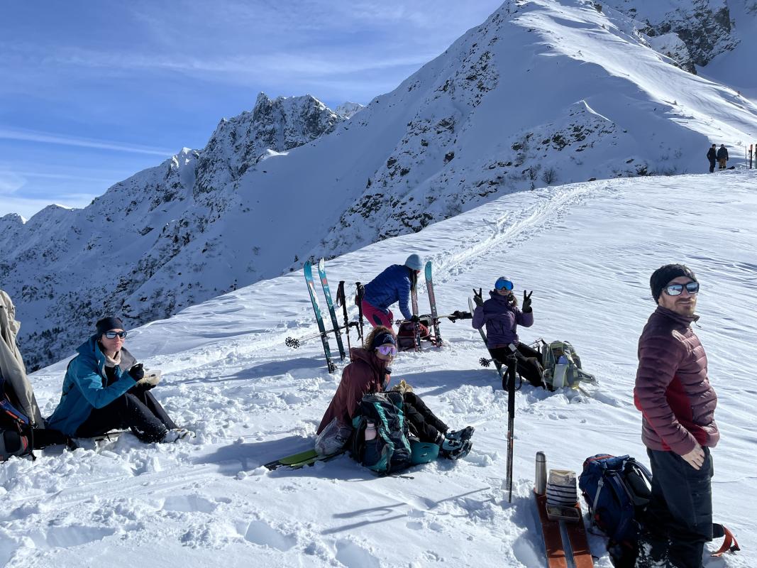 Les garçons nous ont abandonnés (obligations professionnelles) nous partons avec les filles. La montée dans la forêt au milieu des arbres est raide et la trace n'est pas au mieux. Les conversions sont techniques. Le groupe s'en est sorti avec brio et maestria, c'est un ballet de conversions: quelle belle maitrise pour une 2ème sortie! Nous faisons la pause repas au sommet avec le soleil. L'hélicoptère du secours en montagne passe tout près de nous. Nous apprendrons par la suite qu'une avalanche s'est déclenchée au Col de la Pierre, ne faisant aucune victime. Au milieu de la descente, nous effectuons une recherche dva mono victime. Encore une bonne surprise: la prise en main du dva est efficace et rapide, la cible est touchée du premier coup. Bravo à toutes les quatre. Soit les encadrants sont de bons formateurs soit le groupe est doué....je penche pour la 2ème hypothèse. Le final de la descente dans les arcosses est un peu rock & roll, mais ça passe. A bientôt pour notre 3 ème sortie.