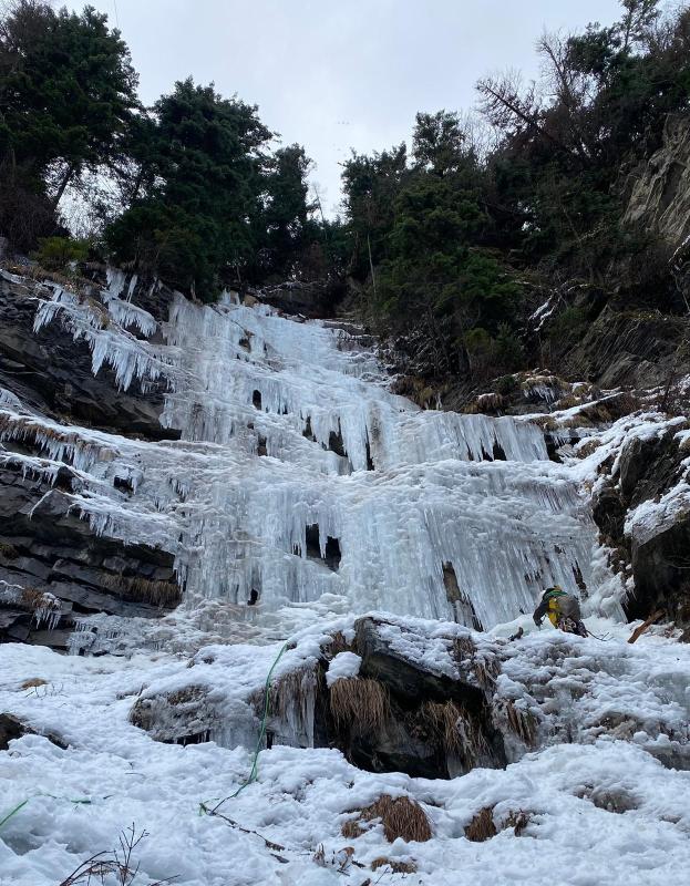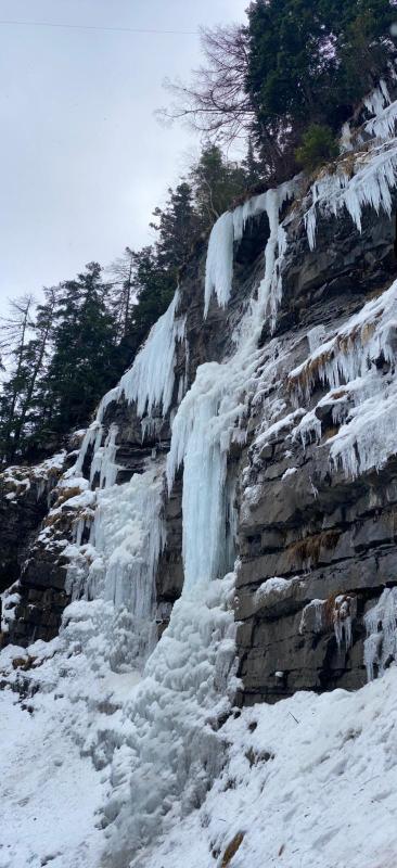 Bonne surprise : la pluie a nettoyé une partie de la neige récente en surface et offre des conditions pas si terribles en début de journée. Après une première longueur d’échauffement pendant l’approche, nous accédons aux cascades de l’Y de droite. Le premier ressaut est très raide et laisse pas mal d’émotions, notamment en tête. S’ensuivent plusieurs moulinettes, avec diverses variantes, qui permettent de contenter tout le monde.