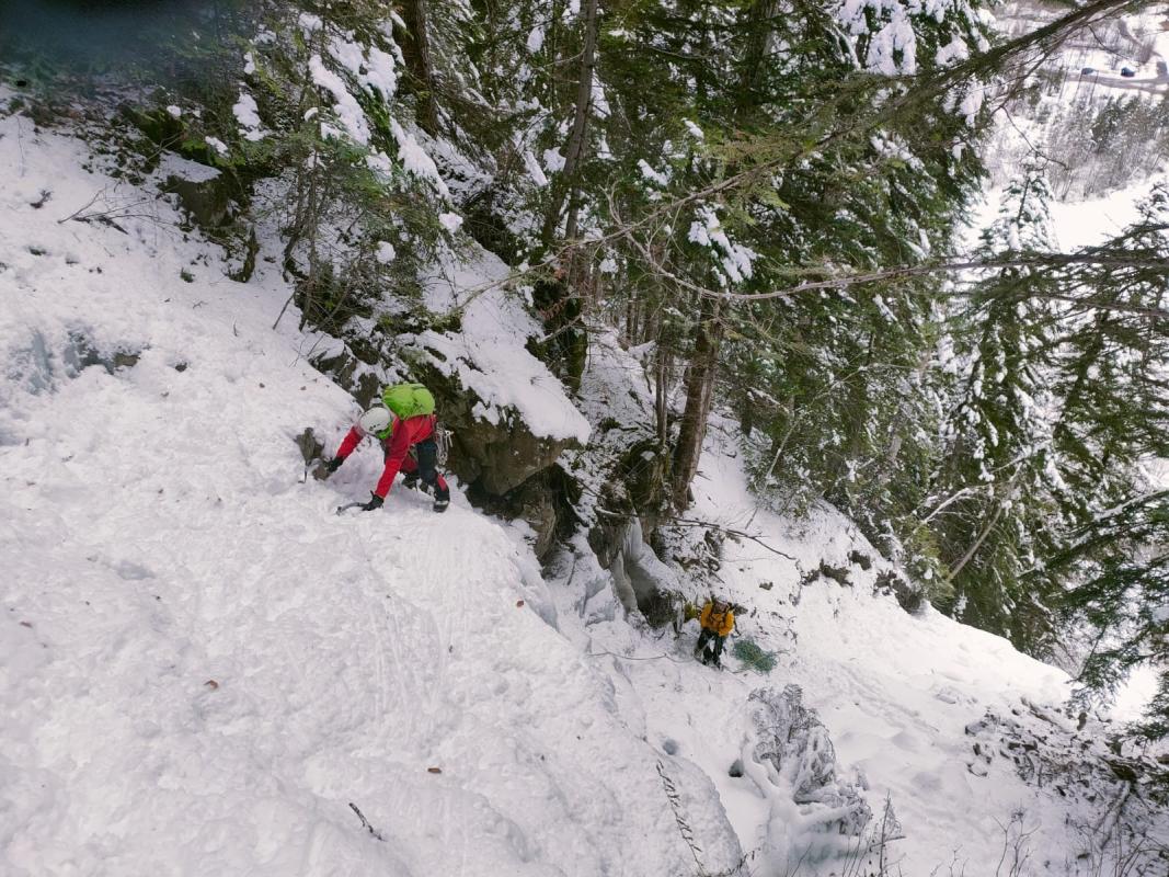 Journée qui commence parfaitement, sous un temps pas trop froid mais suffisamment pour aller se frotter aux cascades. Nous commençons par un premier atelier de brochage sur un ressaut glacé afin de montrer la technique. Qiao et Philippe s’y collent. On enchaîne ensuite sur une magnifique longueur en 4.
