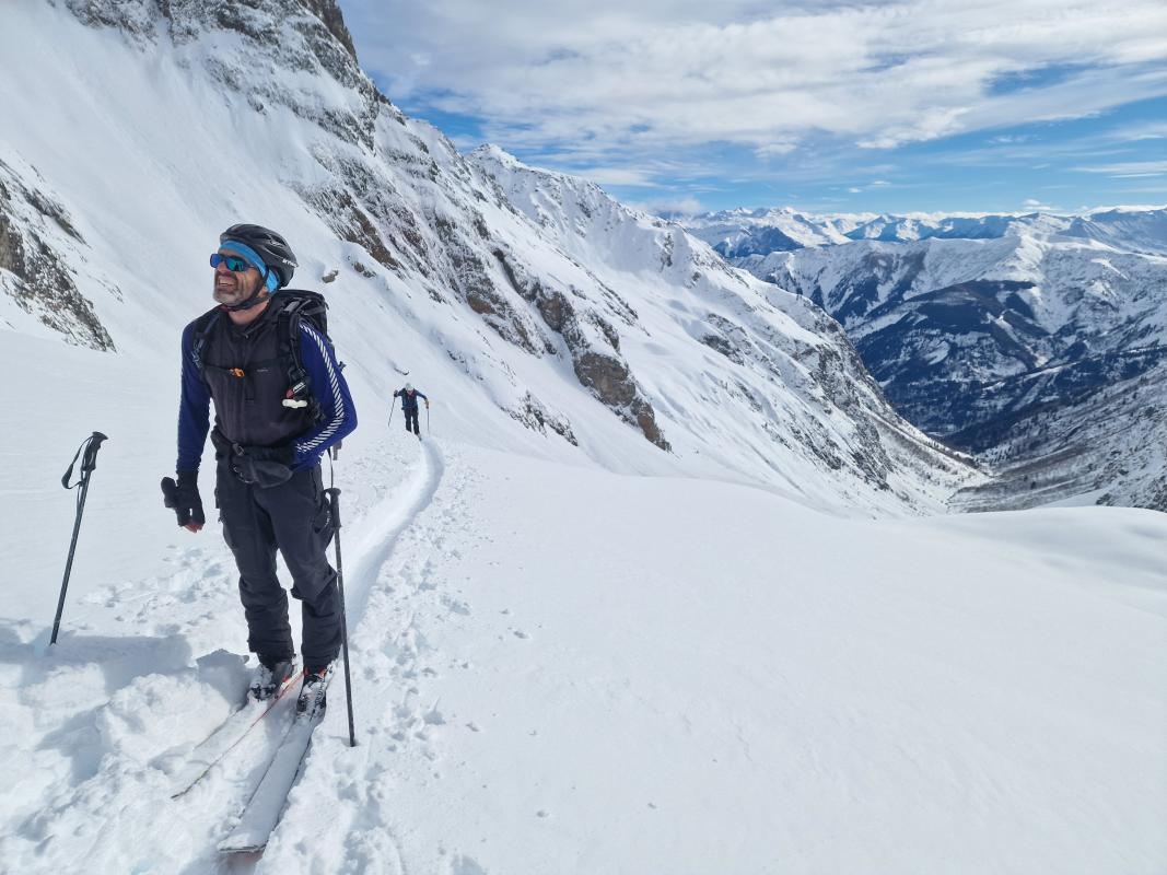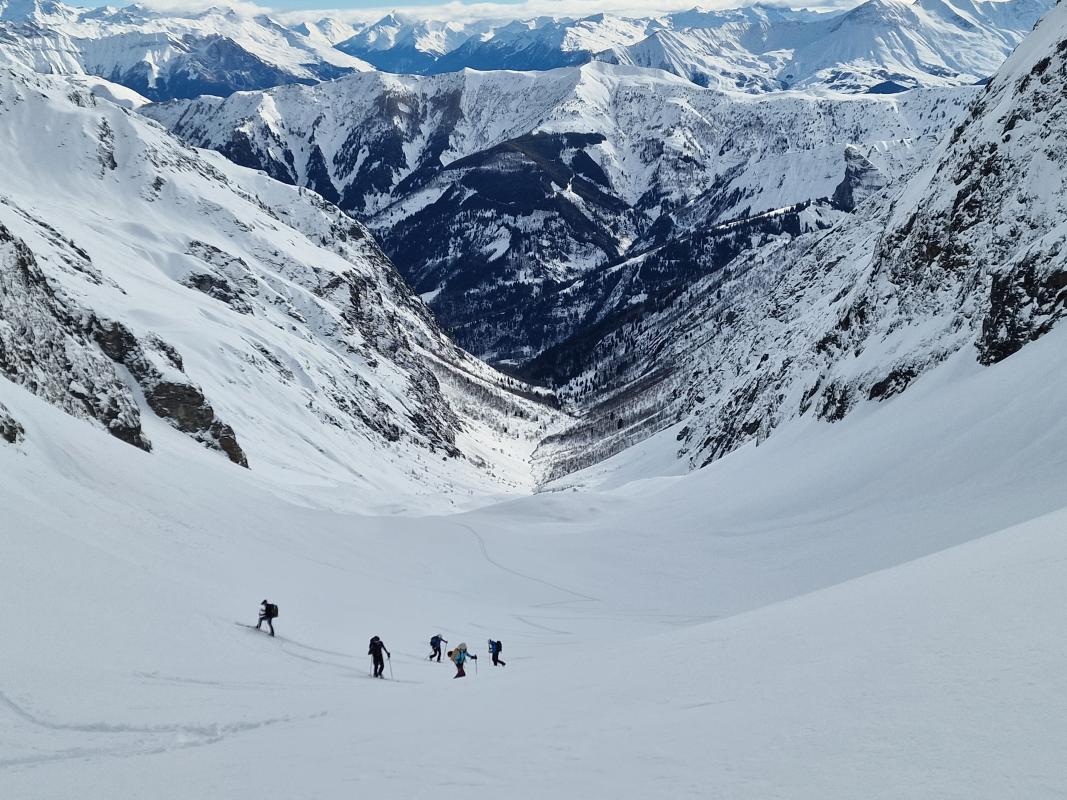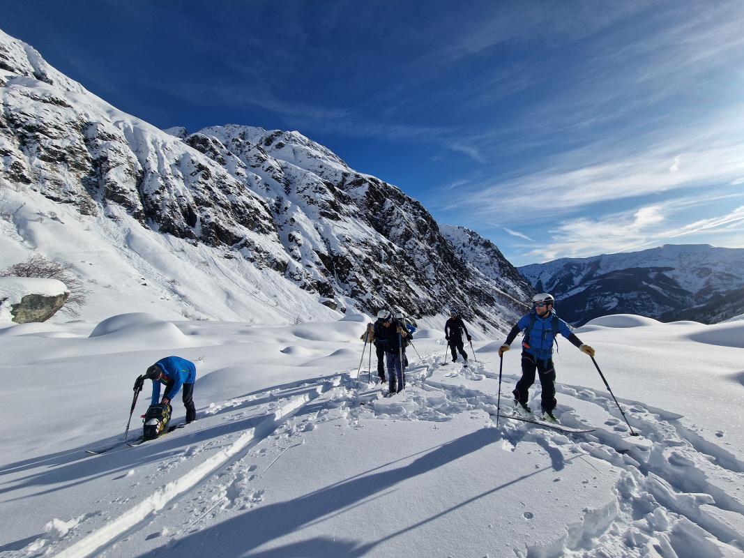 Avec deux désistements la veille pour cause de santé, dont un cadre, la sortie a été sauvée par Romain qui a généreusement accepté de la co-encadrer. Grace à l'heure de départ matinale et au groupe qui s'est montré très efficace et homogène, on a réussi à respecter les délais avec une arrivée au col autour de 12h30. On a croisé plusieurs groupes qui sont partis des Roches, en se partageant la trace en fonction du rythme de chaque groupe. La descente a été bien agréable au dessus de 2000m, mais on a fini en mode "chacun ski comme il peut" sur le chemin d'été, en étant néanmoins contents qu'on a pu garder nos skis jusqu'au village. Malgré les comptes rendus des jours passés concernant la fermeture des bars, ce jour là on a réussi à trouver un ouvert dans le village pour profiter d'une boisson autour d'une table et faire notre debriefing de la journée.