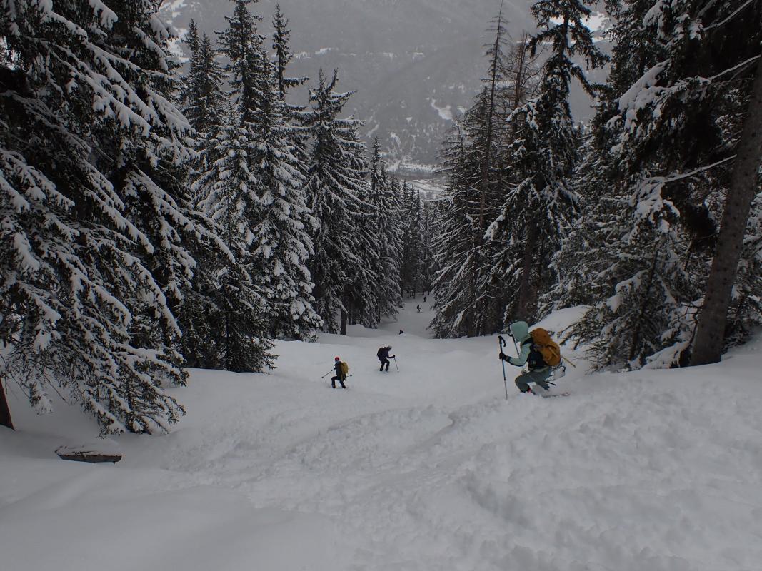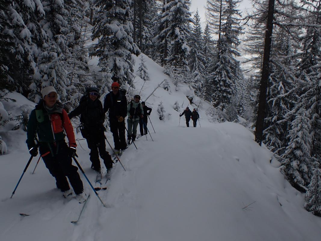 Peu de neige dans le bas surtout sous les arbres (forêt dense). Le final sur la piste de descente était limite enneigé, certains ont préféré passer à pied.