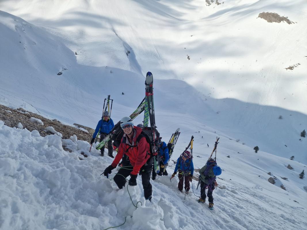 Venue d'une proposition de Pierre, cette course mélangeant ski et alpinisme trouvent vite des adhérents car elle passe en complet peu de temps après sa publication. Certains participants moins habitués avec l'alpinisme appréhendent un peu la Traversée Héroïque, mais les consignes claires du Pierre et les bonnes conditions rassurent vite le groupe. On est tous très contents du choix à la sortie du couloir. L'ambiance lunaire du Plateau de Bure fascinent même ceux qui sont déjà venus. La vue 360° au Pic de Bure permette de repérer d'autres sommets qu'on envisage aborder dans des futures sorties en Dévoluy. A cause du froid on décide de décaler le pique-nique jusqu'au niveau du plateau, ou on trouve un endroit au soleil et à l'abri du vent. La descente nous offre quelques bonnes pentes au niveau de la Combe Ratin avant que la neige commence à s'alourdir au niveau du vallon de Corne. Par contre on est bien contents qu'on puisse arriver skis au pieds jusqu'à la voiture. La journée se termine dans un bar à Corps avec un débriefing de la journée autour d'un verre et un délicieux gâteau offert par Geneviève.