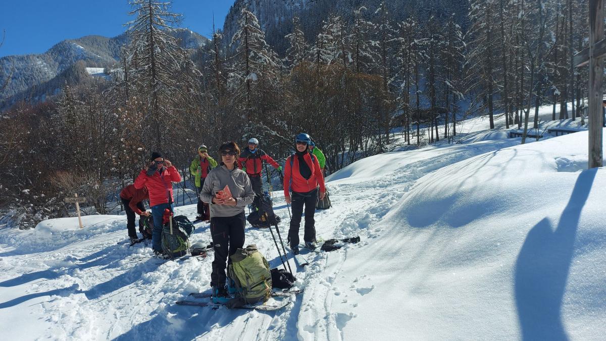 Beau temps, sans vent, 2°C au départ. Suite à le récente chute de neige de 60 cm environ, neige poudreuse lourde, en phase