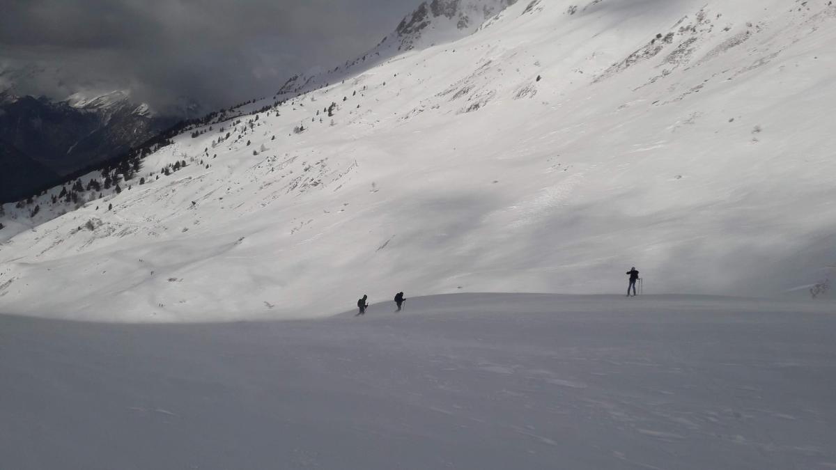 Au point 2100m en direction du Rocher Motas, après avoir croisé qq accumulations instables qui se fissurent devant les spatules et une visibilité limitée nous décidons de virer vers le col du sabot et de rentrer se mettre au chaud.