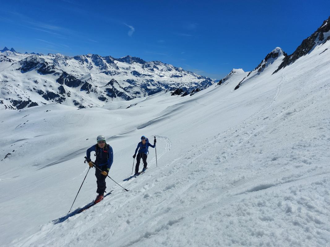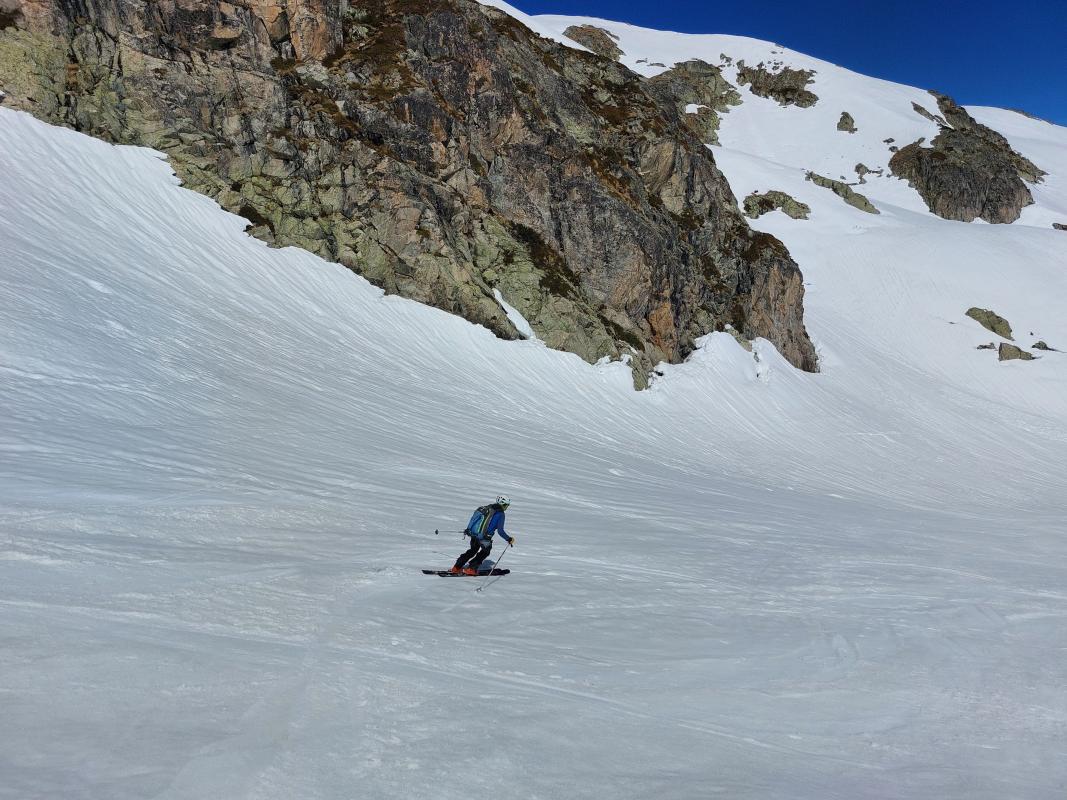 Très beau, chaud mais pas trop sous un léger vent d'Est. Très bon regel et nous avons du mettre les crampons pour passer les derniers mètres du Col de la Vache. Les deux premières descentes étaient en condition "moquette" parfaite.