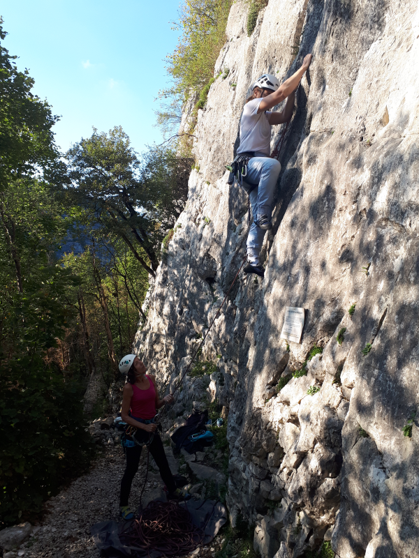 Les relais pédagogiques à droite de la falaise permettent une révision de la manip de haute voie avant de s'élancer dans les voies.