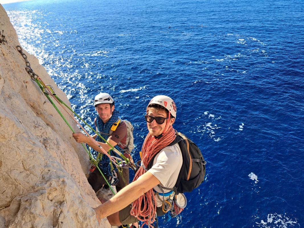 Top ambiance. 4 rappels au dessus de la mer et départ L1 à 10m au dessus de la Méditerranée.