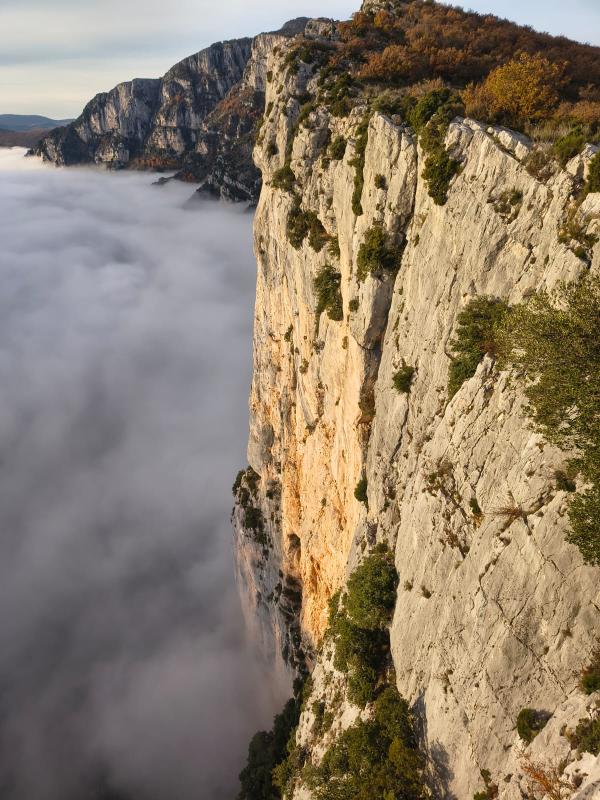 Grand beau. Doudoune le temps des rappels (il gèle le matin) et dès 16h lorsque le soleil passe derrière les falaises. Sinon grimpe en teeshirt. Pas d'autres cordées dans la zone, quelques touristes au belvédère, une armada de Vautours fauves longent la paroi au gré des courants thermiques.