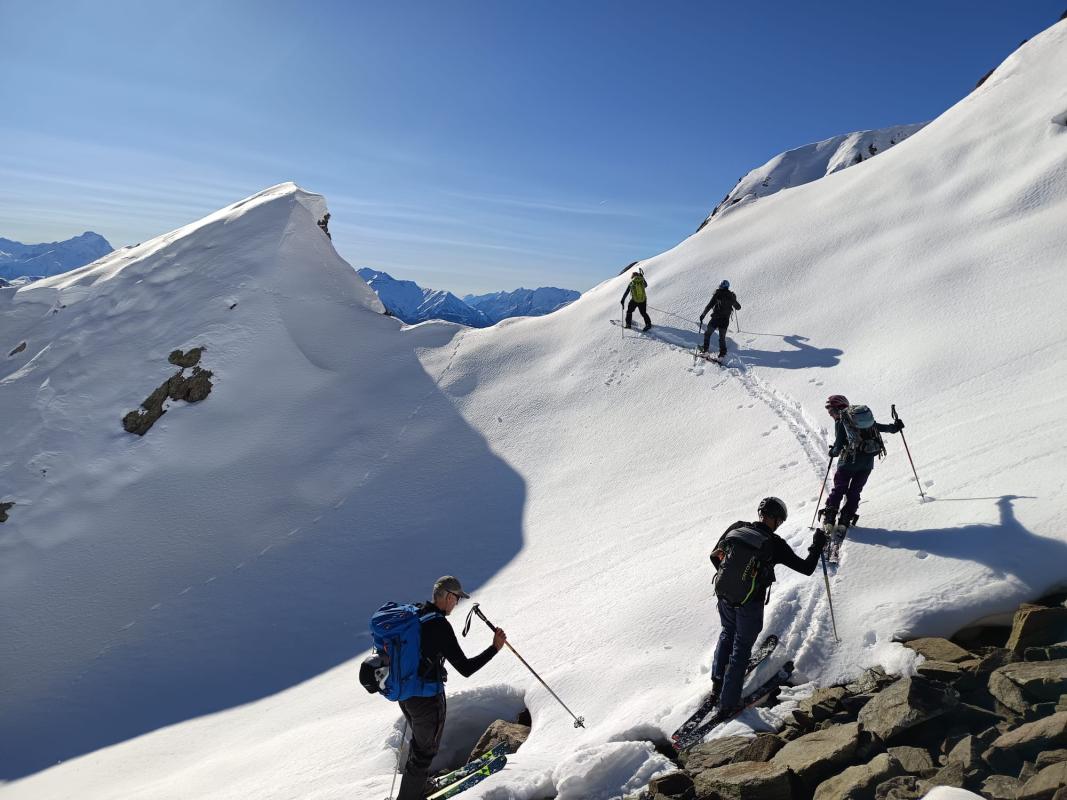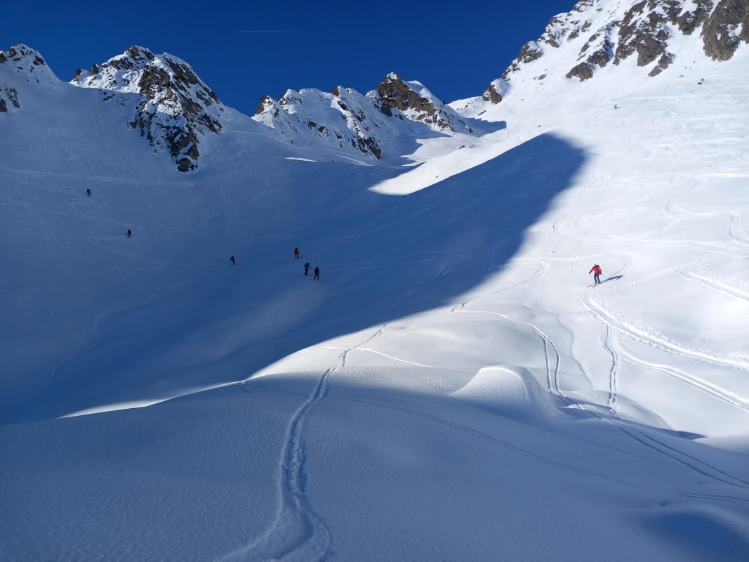 Montée d'un bon rythme, départ 9h15, arrivée 12h à la brèche. Descente à 12h30, on profite d'une neige froide dans les contrepentes du gros Treu, avant de traverser vers les pentes transformées vers 2100. Partie raide négociée sur l'épaule forestière avant de rejoindre la route et les dernières pentes pas si désagréables à skier.
