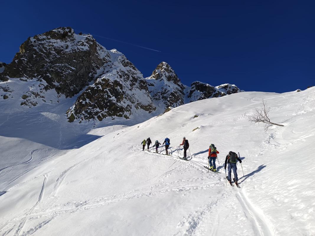 Départ du Collet (Vaujany). Dans l'axe de la pente, en recoupant la route du col du Sabot. Couteaux de mise dans la partie raide entre 1600 et 1900m. Poursuivre dans le vallon entre le gros Treu et les rochers Rissiou jusqu'à la brèche 2306m en RD sous la cime du Rissiou.
