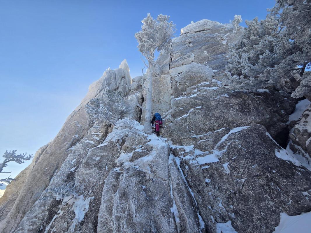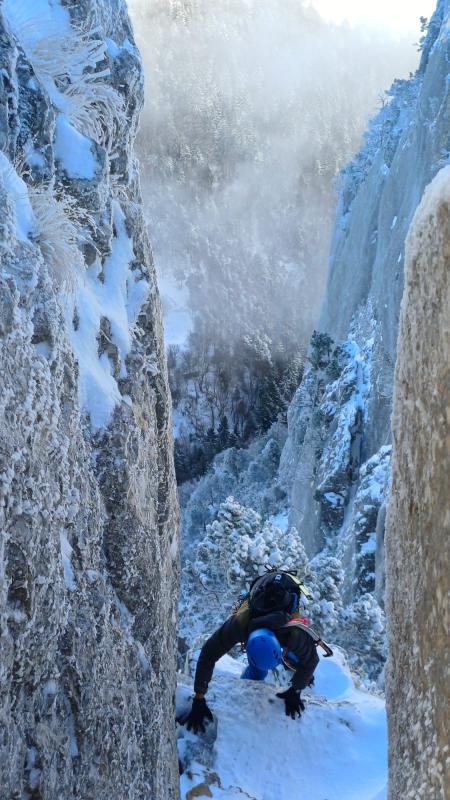 En crampons/piolet, ça rigole pas ! 3 zones de bel effort de grimpe dans le 4, entrecoupées de traversées simples dont la descente finale de l'arête.
