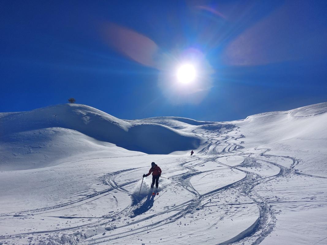 Guillaume va co-encadrer les 3 jours dans le cadre de sa formation. Une première réussie malgré les péripéties à venir. En effet, après une montée magnifique et une première descente dans la poudre, Jean s'est malheureusement blessé au genou dans la deuxième descente (rupture des ligaments croisés). Après la pose d'un bon strap (merci Barbara) nous avons réussi à descendre les 300 derniers mètres de dénivelée en dérapage après un damage collectif efficace.