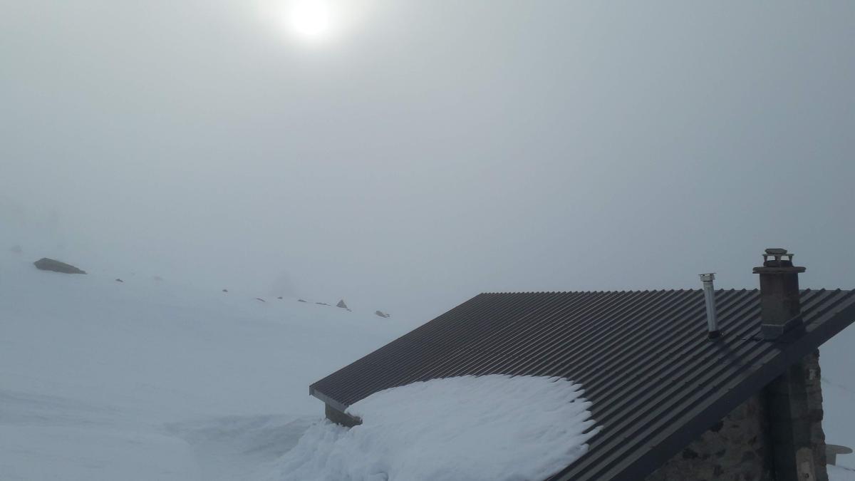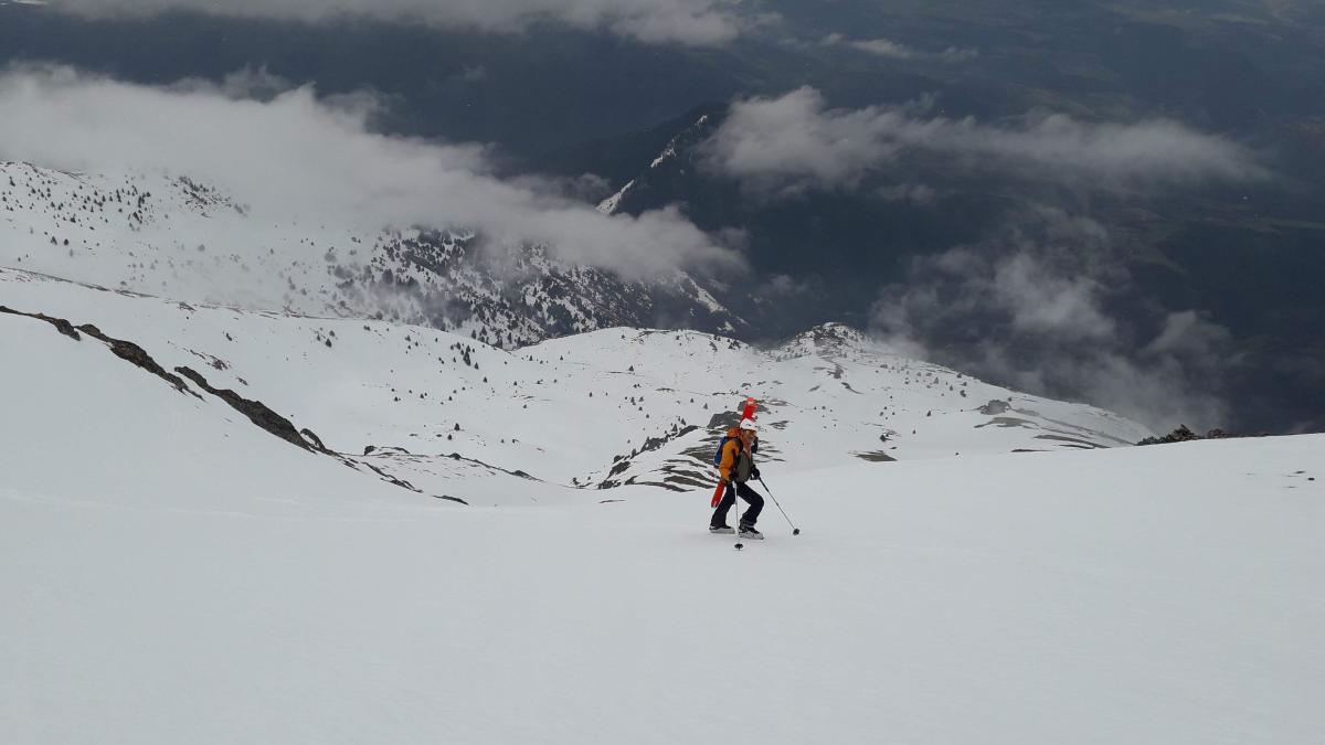 On vise droit, concentré sur nos pas pour atteindre la crête : on sens que la neige est en train de décailler : ça s'annonce bien pour la descente. Une fois sur la crête le sommet est en vu, il ne nous faut pas 10min pour l’atteindre. On prend un moment pour ranger le matos dans nos sac et finir nos casse-croûtes et les nuages nous entoure. On patiente 20min pour avoir une trouée et plonger dans ce long vallon tout droit 800m d-. Le haut est dur et sous 2200m c’est enfin décaillé comme ce qu'on était venu chercher. De retour à la baraque du Jas c’est tout mou, on prend la piste pour retrouver la voiture.
