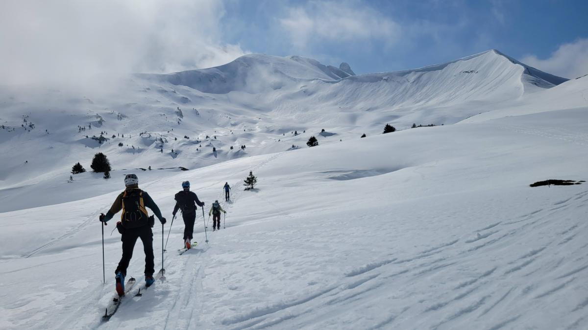 Nous étions parti pour la pointe d'Areu mais trop tard pour les impératifs du jour. Il y a pas mal de replats et de courtes descentes en peaux. Nous pensions gagner un peu de temps en prenant le téléski qui sur la carte fait gagner presque 300m de D+, mais en réalité nous avons gagner seulement 100m de D+. Belles arêtes le long du parcours mais c'est quand même un peu trop plat.