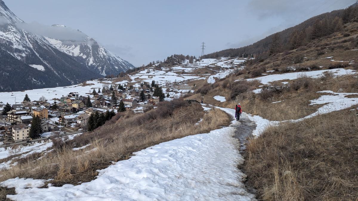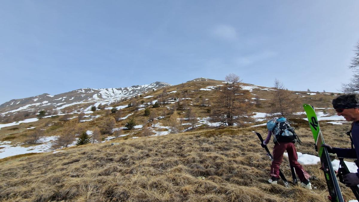 L'idée était attrayante ! Un départ à 1800m, 1200m de D+ et une orientation sud. Que nenni ! La face est sèche et visiblement l'enneigement autour de Cogne est bien faible. Nous sommes monté jusqu'à la sortie de la forêt de mélèzes (2200m) avant de redescendre. Le coin est beau mais demande un très bon enneigement. Nous reviendrons.