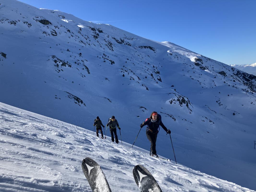 Un groupe homogène et dynamique… J’espérais descendre le versant Est du Perollier mais il était trop tard… une coulée est partie sous mes skis et naturellement nous sommes descendus plein nord !