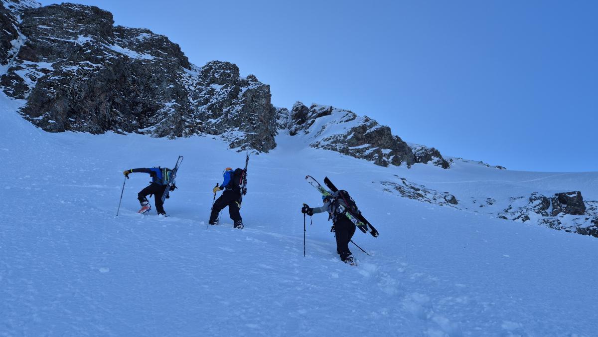 Petit groupe, et il ne fallait pas être plus nombreux pour cette randonnée exigente. Nombreuses manips (dépeautage, crampons, repeautage). On a tracé à pied depuis le pied du coulor Ouest pour passer dans les vires (exposition) et pentes raides. Le neige est meuble, on enfonce un peu, merci à tous pour le tour de role au tracage.