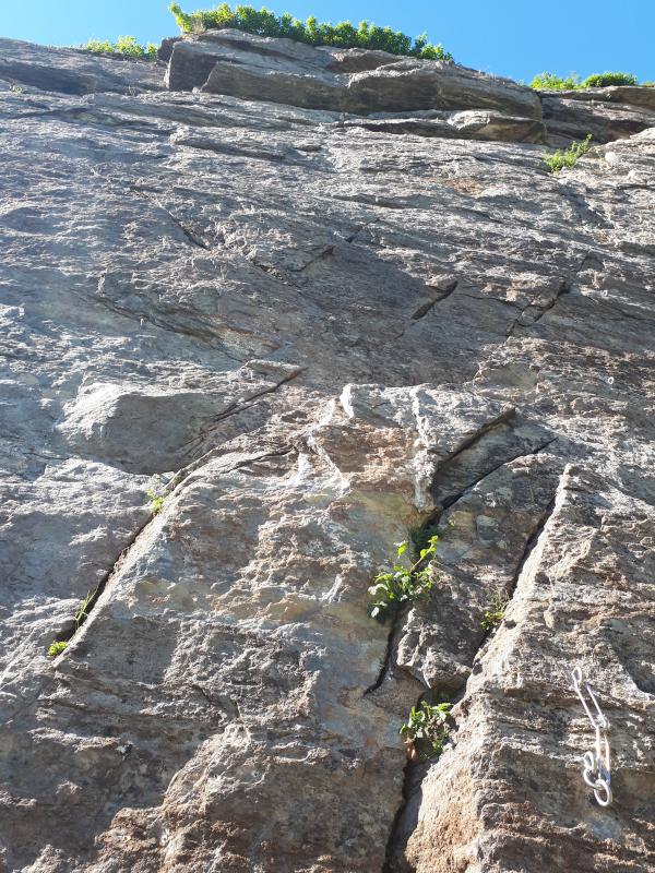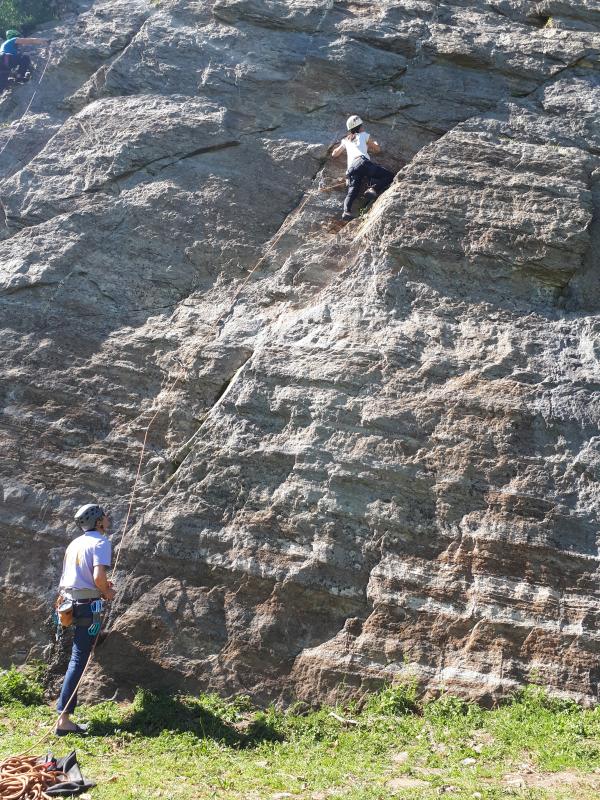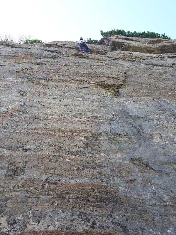 Nous avons d'abord révisé la manip de haute voie grâce au relai pédagogique installé au pied de la falaise. Gabrielle a commencé par grimper la Rampe des Commères. Puis Pierre et Gabrielle ont grimpé Arbréoplane. La voie commence par une section en dalle avant d'atteindre une écaille. Les difficultés se concentrent principalement sur la première partie en dalle de la voie. Ensuite, ils ont grimpé la voie d'à côté, Hugo est lent, qui comme sa voisine, commence par une section en dalle mais d'un niveau un peu au-dessus. Une dégaine rallongeable est à prévoir dans la partie haute de la voie (point à clipper un peu décalé à droite de la ligne). Puis, Pierre a grimpé Lézard Hard (6b) à vue. Enfin, l'après-midi s'est terminé par l'escalade de Lion hell road.