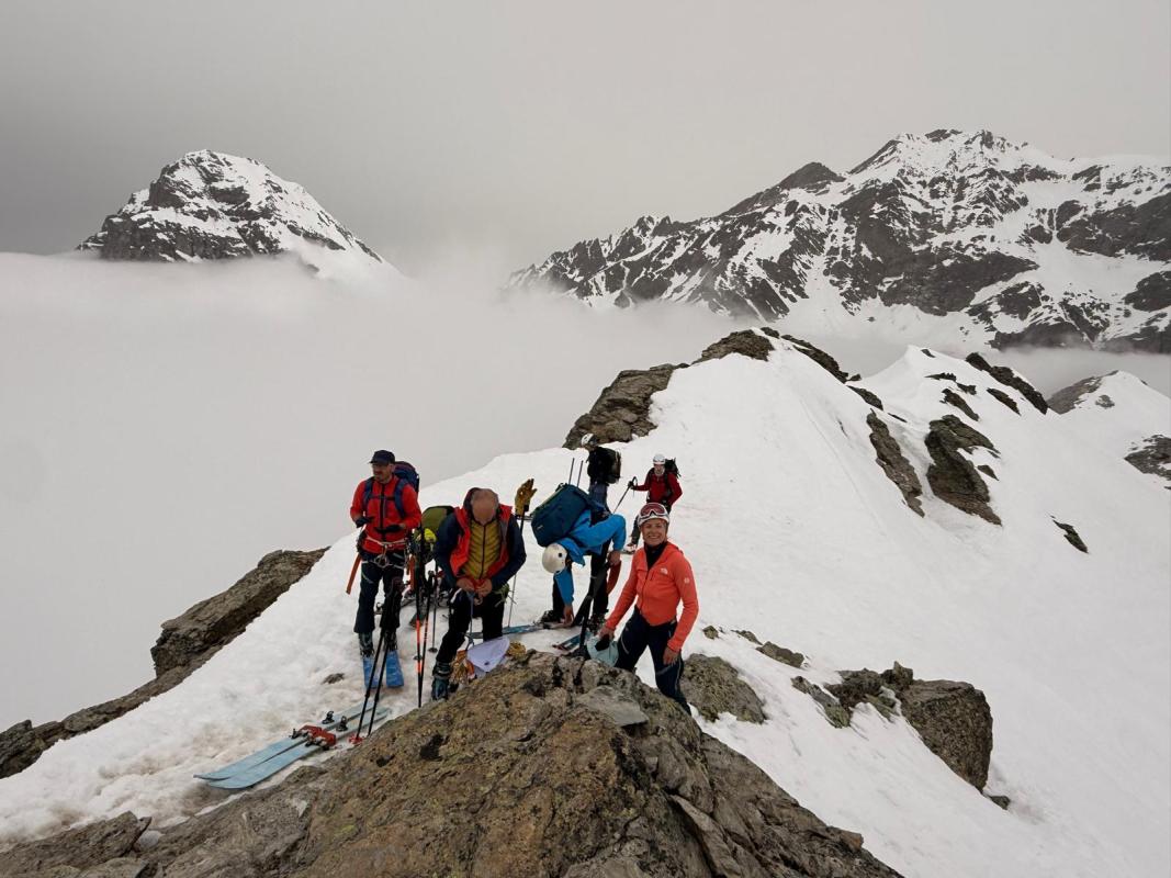 La sortie au col semble corniché, le vent est venu s'ajouter à notre journée, du coup détour par la gauche pour rattraper le col par l'arrête ski sur le dos, crampons pour certains, on est content d'atteindre le col après 2h30 de montés et 2 rouleaux de scotch...