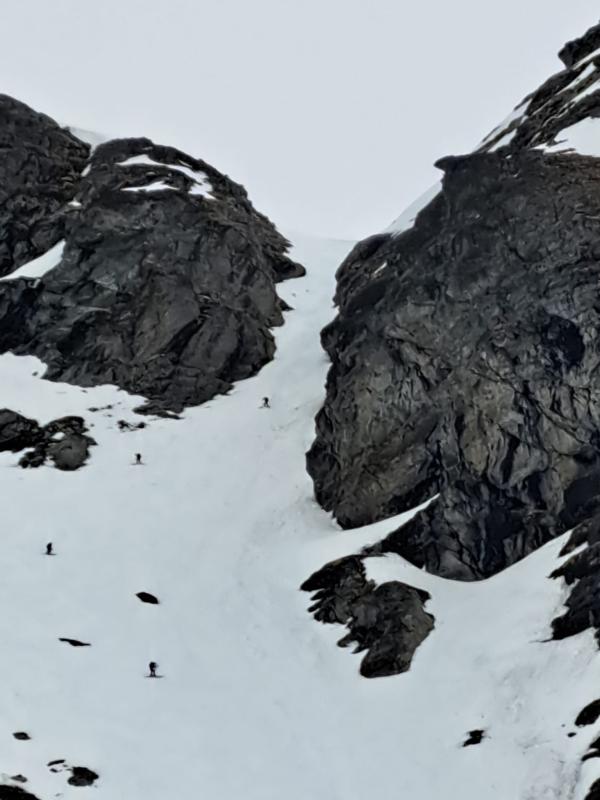 On remonte 100m avec les couteaux sur une neige bien dur pour atteindre un couloir face sud pour accéder à notre itinéraire de retour. C'est un couloir en 3.3 bien dur voir gelé, François se lance dedans en petite godille suivie par le reste du groupe en mode virages, dérapages, escalier, chacun son style! On avait dit ski 3.3 du coup ça c'est fait, félicitation à tous pour cette descente pas évidente dans des conditions assez mauvaise!