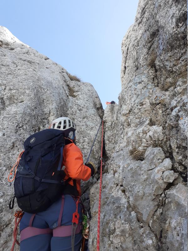 Une belle ambiance dans la goulotte. La sortie sur l'arête et la redescente nous ont permis de diversifier le parcours tout en profitant de la vue, toujours superbe.