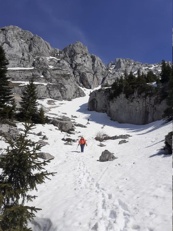 En cette fin de saison, la goulotte est peu remplie, avec une succession de couloirs de neige et ressauts rocheux. Dans ces conditions, le parcours est un peu moins technique.