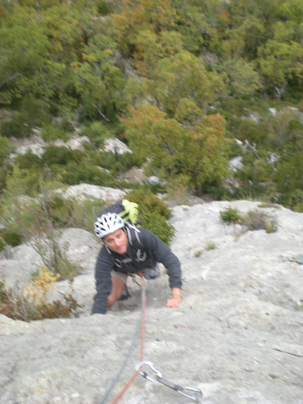 La pluie nous oblige à tirer des rappels dans la voie : impossible de sortir au sommet, la dalle finale mouillée étant trop difficile.