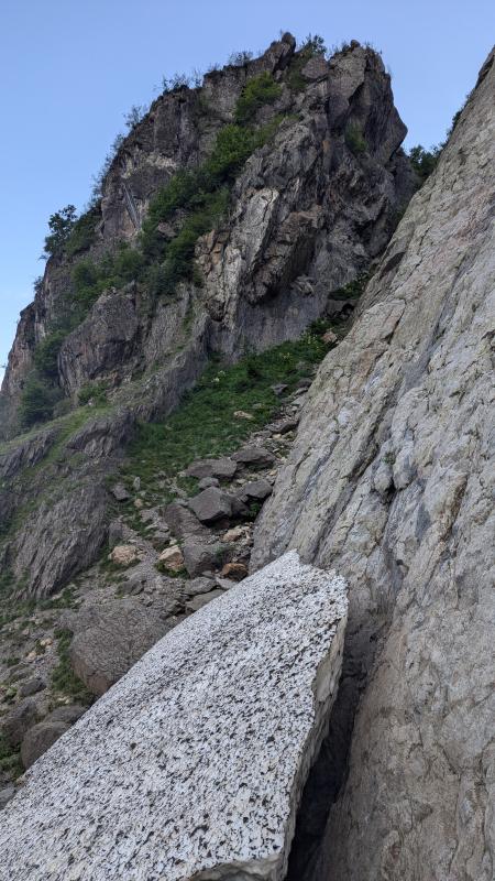 Encore un névé au pied des voies. Vent soutenu et soleil.