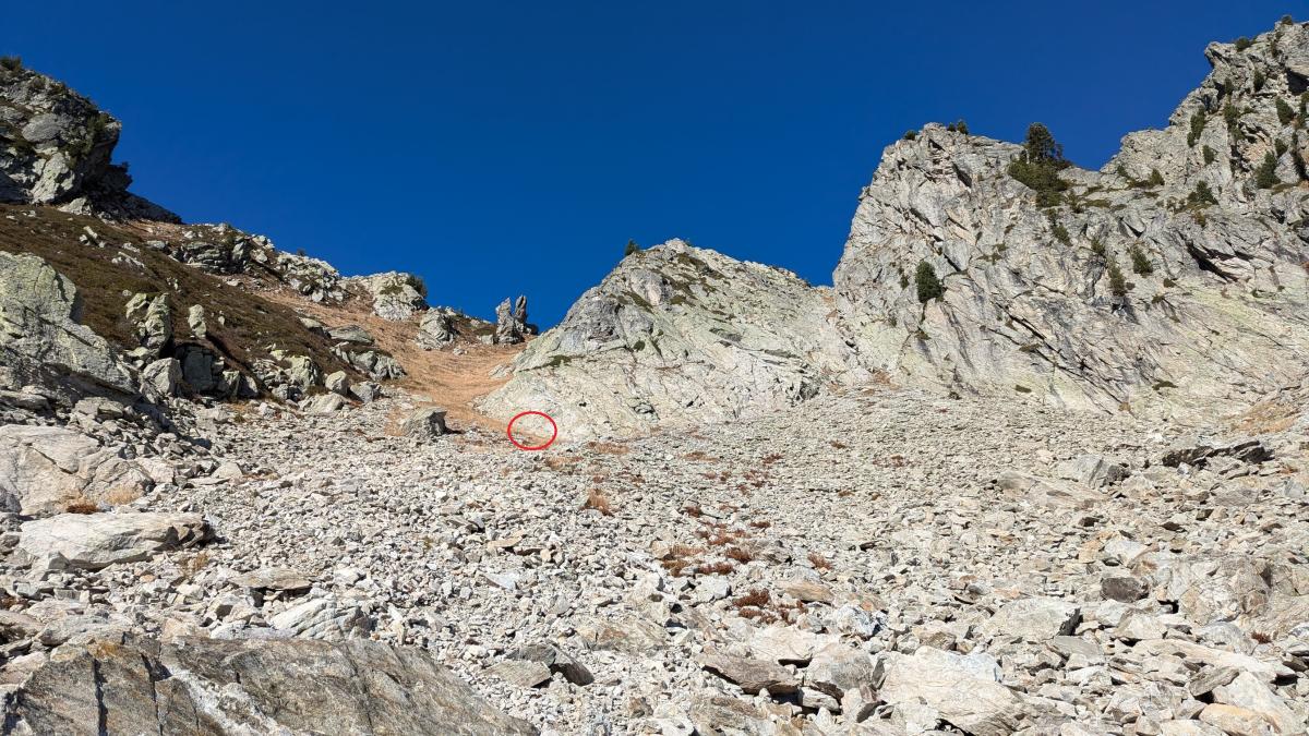La voie remonte les dalles en rive gauche (sens orographique) du couloir menant à la brèche située au N des 2 petits rochers en forme de Ciseaux.