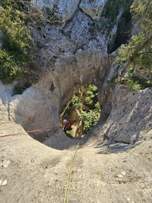 Second jour de couenne pour certains et troisième pour les autres. Aujourd'hui nous nous rendons vers Russan un site mythique au dessus du Gardon. La marche d'approche nous amène en haut d'une curiosité géologique dont notre guide a le secret. Un rappel en fil d'araignée plus tard et nous sommes aux pieds des voies. Du soleil, des colonnettes, de la dalle, des gouttes d'eau et un cadre magnifique. Encore une bonne journée de grimpe avec un groupe au top !