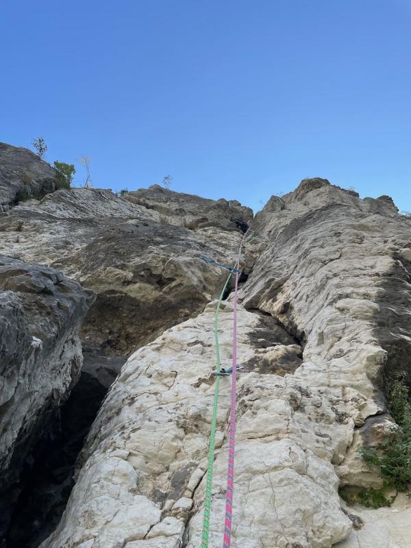 Conditions bien instables pour ce samedi, d'où le choix d'une voie courte et facile à réchapper (et pas loin!). Averses avant d'attaquer puis temps s'améliorant franchement avec quelques rafales de vent vers le sommet, mais non gênantes pour la grimpe.