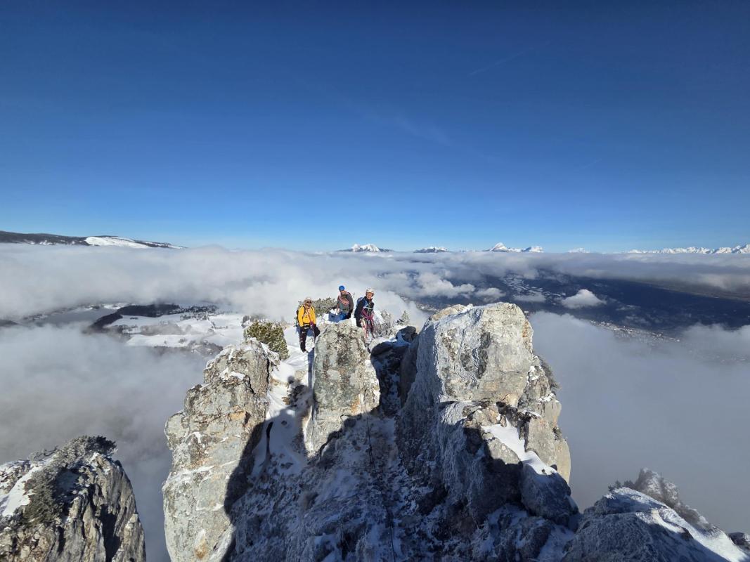 En crampons/piolet, ça rigole pas ! 3 zones de bel effort de grimpe dans le 4, entrecoupées de traversées simples dont la descente finale de l'arête.