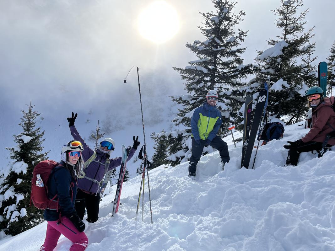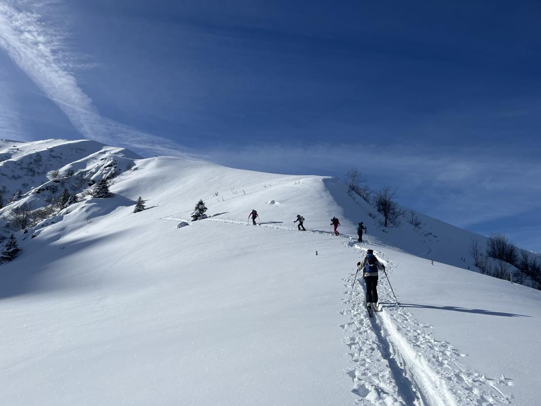 Les garçons nous ont abandonnés (obligations professionnelles) nous partons avec les filles. La montée dans la forêt au milieu des arbres est raide et la trace n'est pas au mieux. Les conversions sont techniques. Le groupe s'en est sorti avec brio et maestria, c'est un ballet de conversions: quelle belle maitrise pour une 2ème sortie! Nous faisons la pause repas au sommet avec le soleil. L'hélicoptère du secours en montagne passe tout près de nous. Nous apprendrons par la suite qu'une avalanche s'est déclenchée au Col de la Pierre, ne faisant aucune victime. Au milieu de la descente, nous effectuons une recherche dva mono victime. Encore une bonne surprise: la prise en main du dva est efficace et rapide, la cible est touchée du premier coup. Bravo à toutes les quatre. Soit les encadrants sont de bons formateurs soit le groupe est doué....je penche pour la 2ème hypothèse. Le final de la descente dans les arcosses est un peu rock & roll, mais ça passe. A bientôt pour notre 3 ème sortie.
