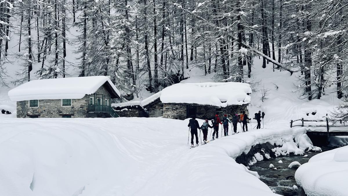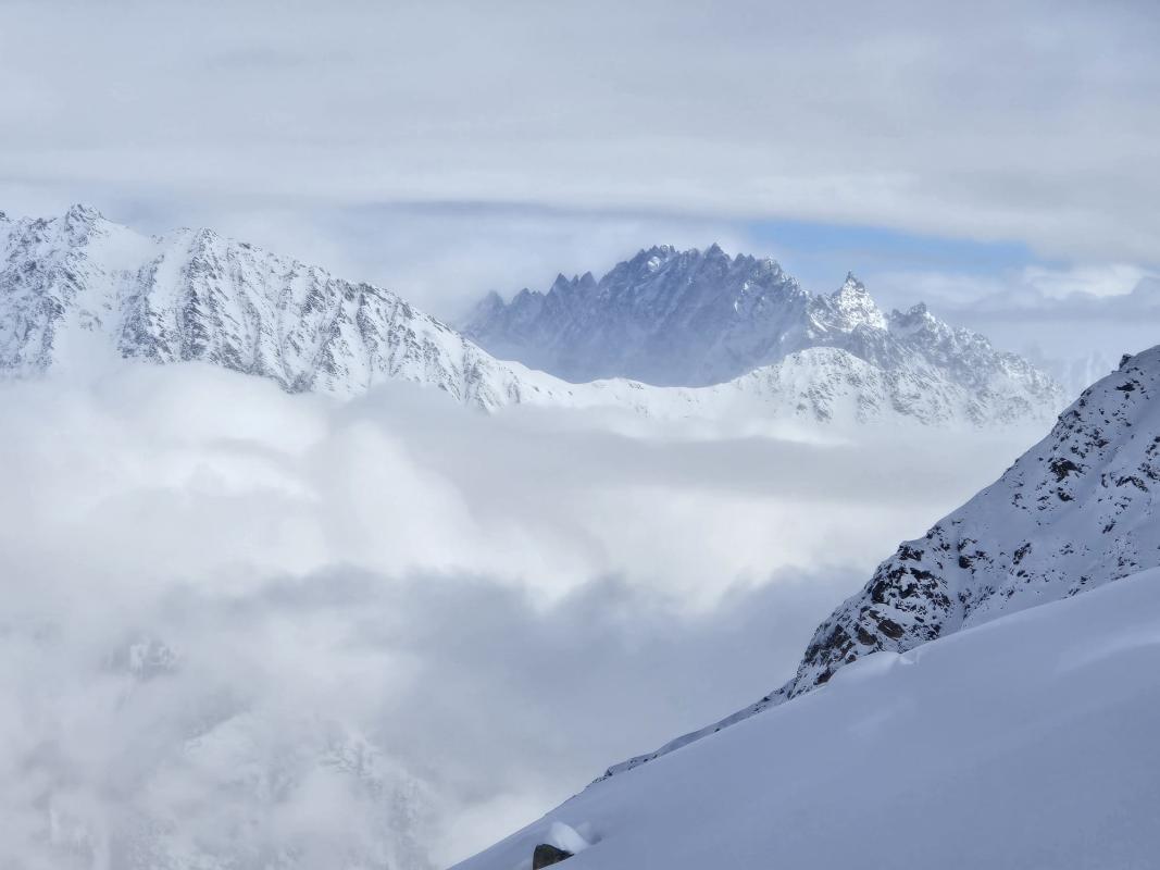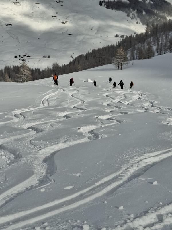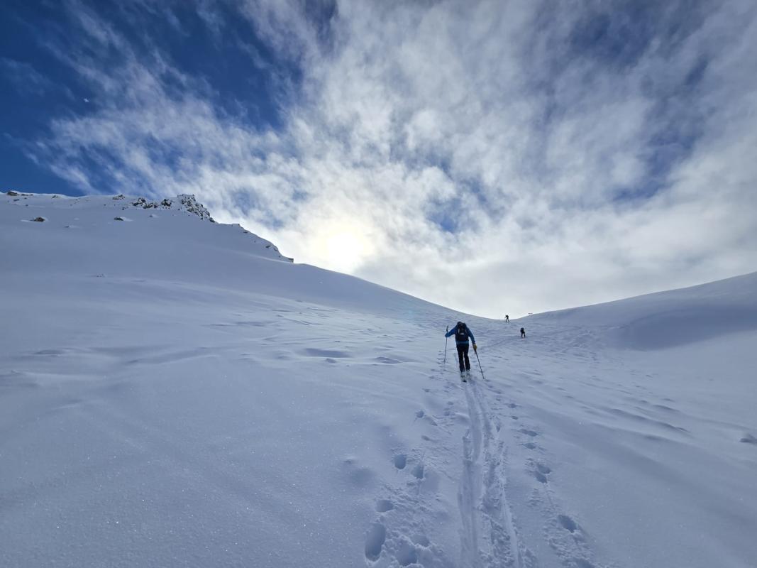 Première sortie de séjour dans le Val d’Aoste, Grand Saint-Bernard. La neige de la nuit nous aura permis de profiter d’une belle poudreuse à la descente. C’est un secteur très calme où on ne rencontre que très peu de randonneurs. Le groupe est bien homogène aussi bien à la montée qu’à la descente, ce qui nous permet d’avoir des relais pour tracer dans la poudreuse.