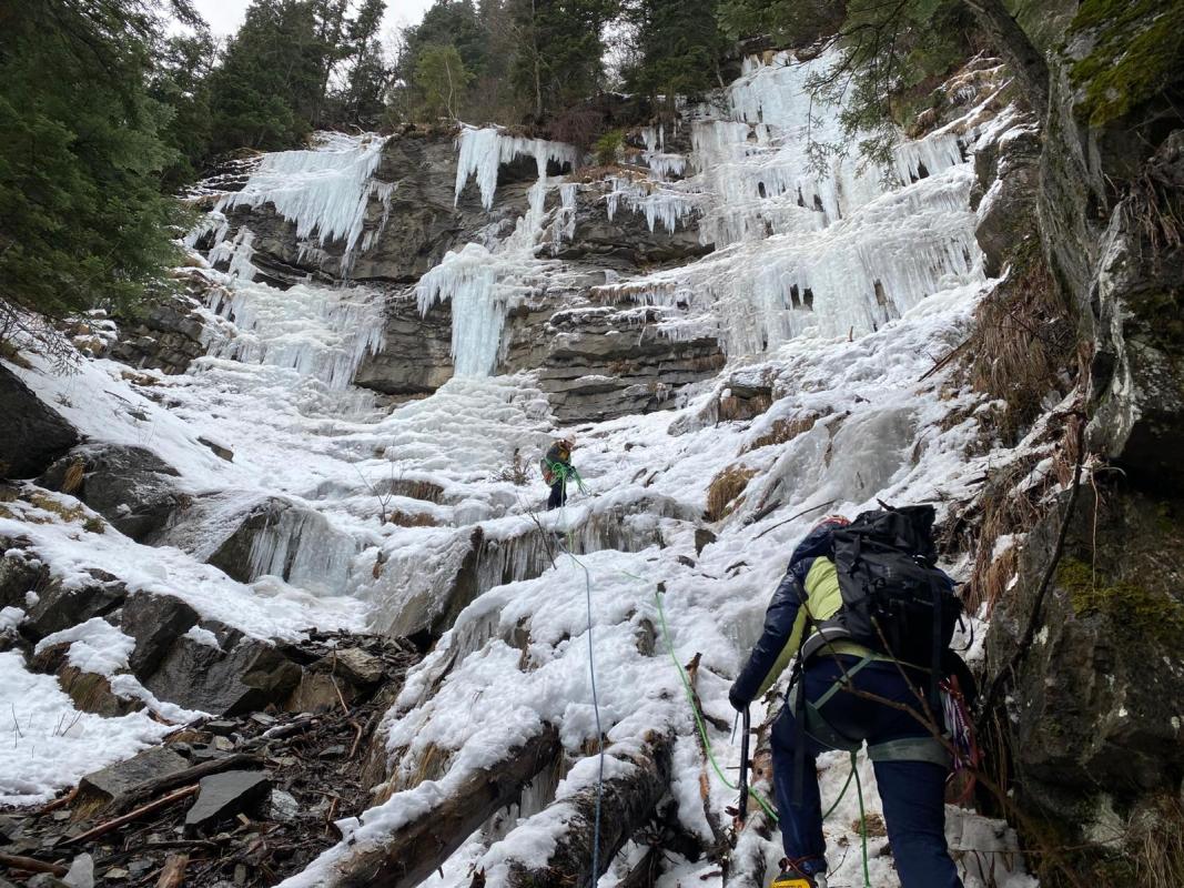 Bonne surprise : la pluie a nettoyé une partie de la neige récente en surface et offre des conditions pas si terribles en début de journée. Après une première longueur d’échauffement pendant l’approche, nous accédons aux cascades de l’Y de droite. Le premier ressaut est très raide et laisse pas mal d’émotions, notamment en tête. S’ensuivent plusieurs moulinettes, avec diverses variantes, qui permettent de contenter tout le monde.