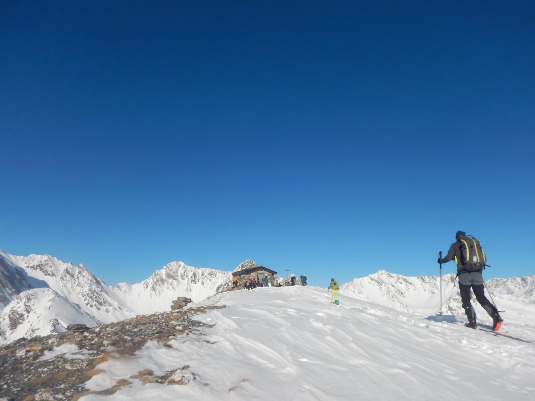 Au départ, 0°C, faible vent, risque 3, visibilité entre 50 et 300 m, petite neige continue. Vieille neige ramollie, recouverte par une couche de poudreuse de 10 à 30 cm. Arrivés au col, une légère éclaircie nous incite à aller jusqu'au sommet.