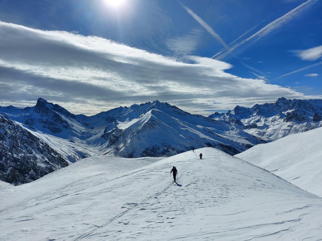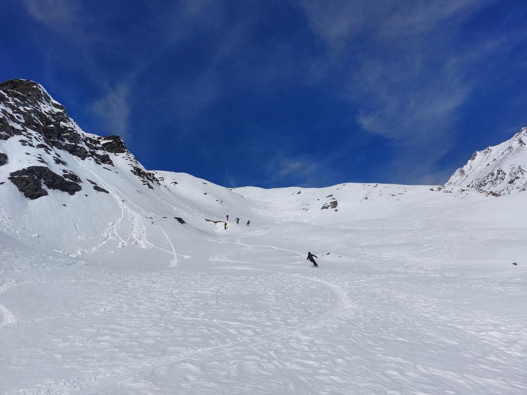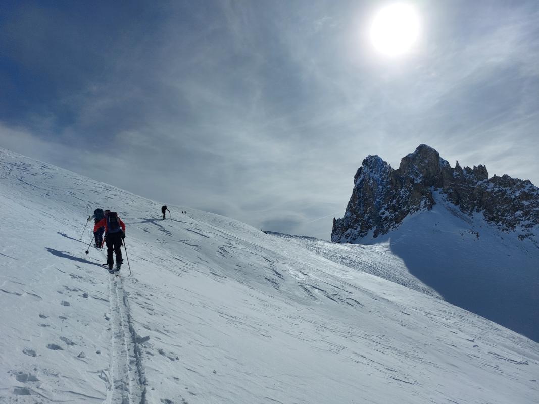 La troisième et dernière journée du week-end. Nous avons choisi cet itinéraire plutôt que la face nord de la Tête de Gandin puisque le ravin de Chabrière nous avait été déconseillé par d'autres skieurs la veille. Le choix était bon puisque nous avons réalisé une très belle course bien variée avec une incursion dans le Queyras et avec une très belle descente finale en bonne condition.