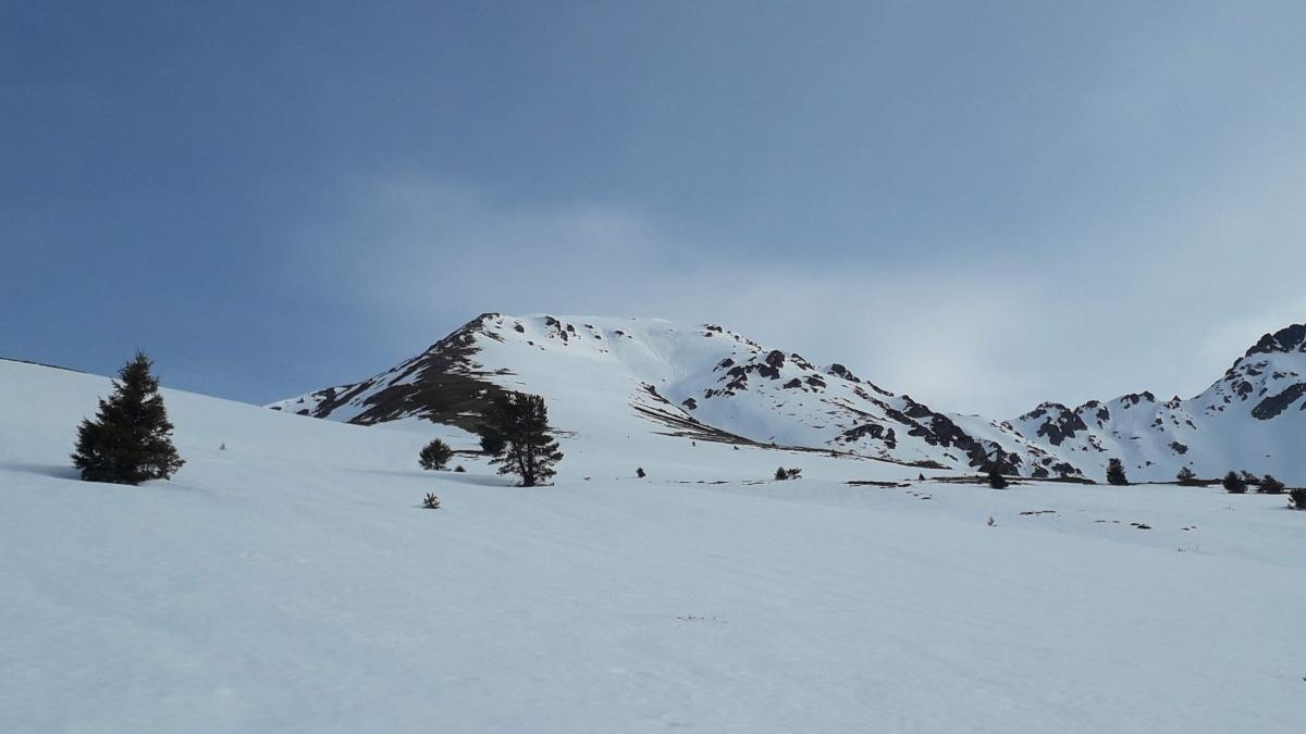 Cool ce matin on est 2 solitaires et, la neige est bien remontée, on gare la voiture à 1420m dans un lacet de la piste ou enfin la neige nous bloque et on ou l’on peut chausser. On continu en ski en suivant la piste jusqu’à la cabane de la Jas, le soleil se cache et la neige est très humide on est un peu inquiet pourra t-on aller jusqu’au sommet ? Passer la baraque du Jas enfin le regel et une éclaircie nous permet de découvrir le vallon sud et le sommet. La pente se redresse régulièrement et arrivé à 2200m on se pose pour manger un morceau et chausser les crampons : on est déjà dans un gros 35° avec en dessous une belle barre rocheuse qu’on surplombera tout du long; la chute n’est pas permise aujourd’hui.