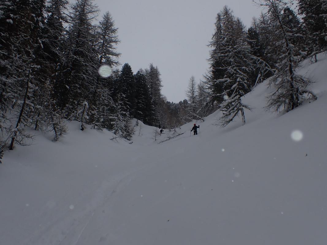 Peu de neige dans le bas surtout sous les arbres (forêt dense). Le final sur la piste de descente était limite enneigé, certains ont préféré passer à pied.
