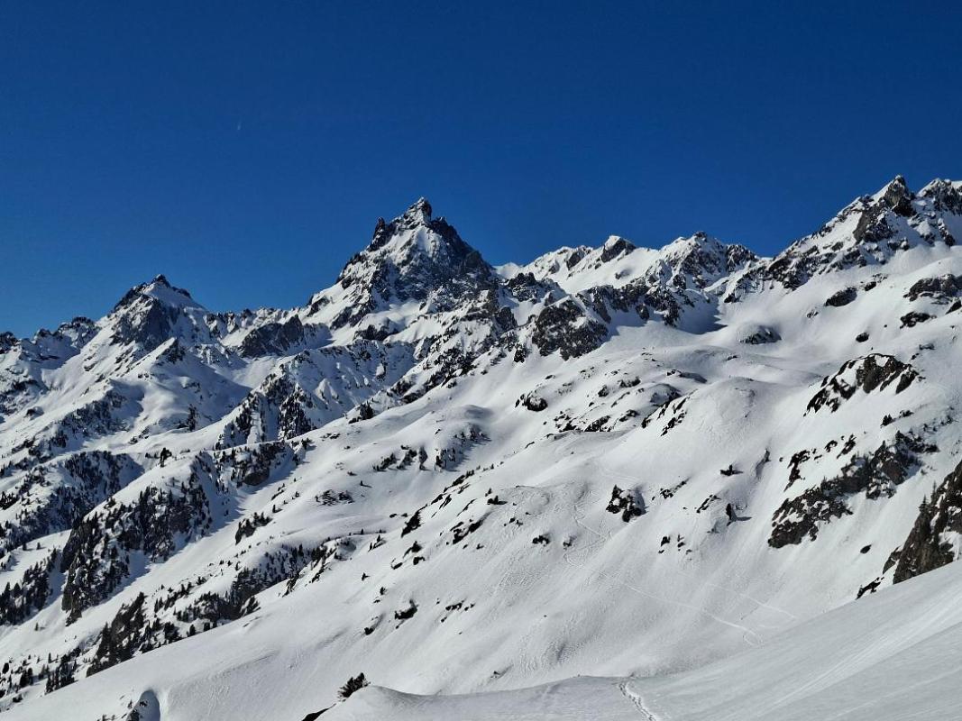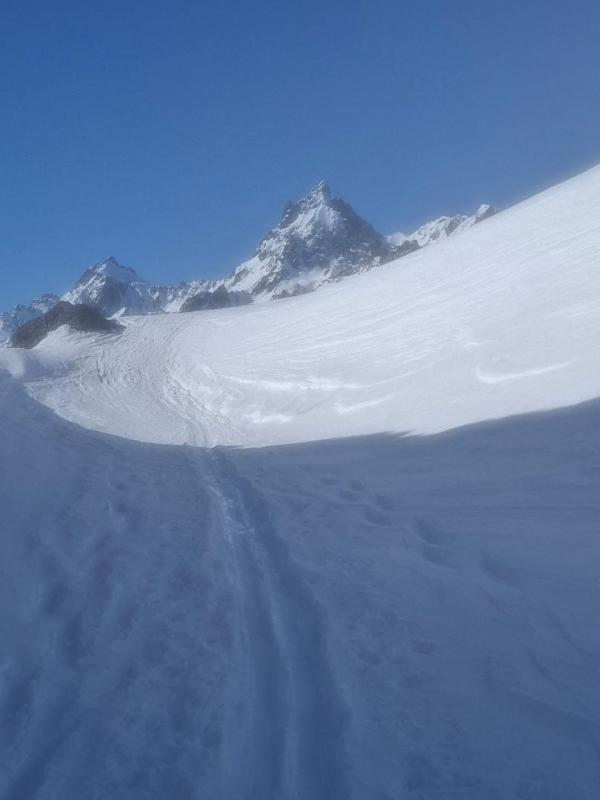 Arrivés tôt au sommet le choix de l'itinéraire de descente pour profiter de la meilleure neige se pose, entre les versants sud-est parsemés de coulées et de neige non transformée nous choisissons de descendre le versant du Rivier d'Allemond et de faire un beau tour. Mais soudain soudain nous sommes pris par un nuage dense, visibilité quasi nulle. Après un moment d'attente nous reprenons la descente...nouvel obstacle un immense couloir qui ne demande qu'à descendre, le seul qui ne soit pas tombé dans le secteur. Par mesure de sécurité nous remontons au sommet cette fois dans le mauvais temps, vent violent et glacial. Du sommet nous redescendons l'arête à pied sous les bourrasques. Nous rechaussons mais la neige regèle et c'est par des conversions aval que nous redescendons.
