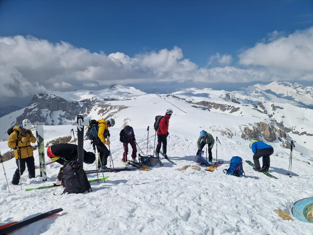 Venue d'une proposition de Pierre, cette course mélangeant ski et alpinisme trouvent vite des adhérents car elle passe en complet peu de temps après sa publication. Certains participants moins habitués avec l'alpinisme appréhendent un peu la Traversée Héroïque, mais les consignes claires du Pierre et les bonnes conditions rassurent vite le groupe. On est tous très contents du choix à la sortie du couloir. L'ambiance lunaire du Plateau de Bure fascinent même ceux qui sont déjà venus. La vue 360° au Pic de Bure permette de repérer d'autres sommets qu'on envisage aborder dans des futures sorties en Dévoluy. A cause du froid on décide de décaler le pique-nique jusqu'au niveau du plateau, ou on trouve un endroit au soleil et à l'abri du vent. La descente nous offre quelques bonnes pentes au niveau de la Combe Ratin avant que la neige commence à s'alourdir au niveau du vallon de Corne. Par contre on est bien contents qu'on puisse arriver skis au pieds jusqu'à la voiture. La journée se termine dans un bar à Corps avec un débriefing de la journée autour d'un verre et un délicieux gâteau offert par Geneviève.