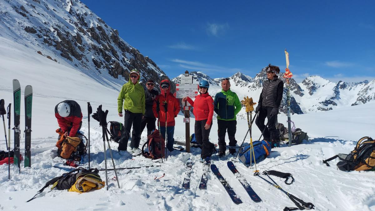 Beau temps, sans vent, 2°C au départ. Suite à le récente chute de neige de 60 cm environ, neige poudreuse lourde, en phase