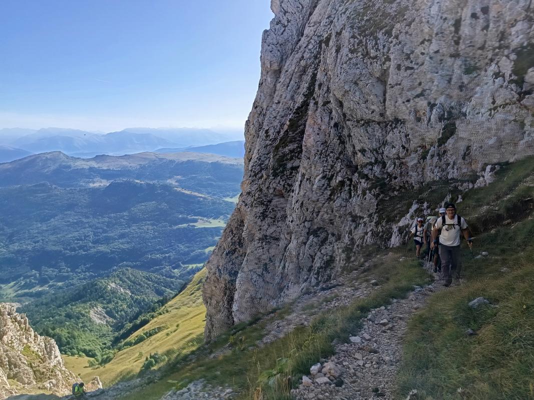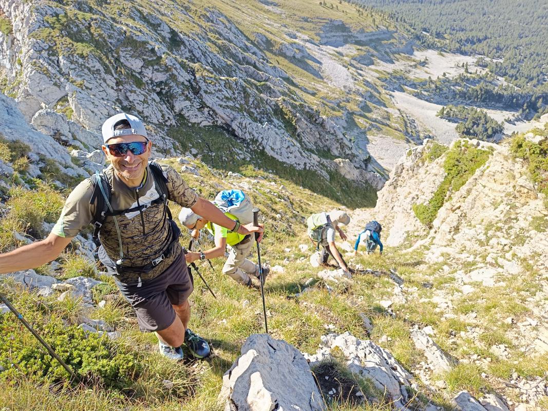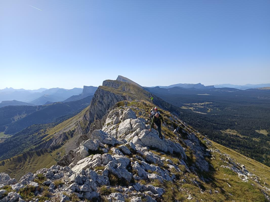 Boucle de 15 km, très variée entre les falaises verticales coté est et les pentes herbeuses ou forestier du haute plateau du Vercors. En grand partie hors chemin. Seuls sur la crête nous avons vu des bouquetins et des écoles de vautours. Merci a Gabrielle qui nous a régalé de cubes de melon et des demi-lunes!