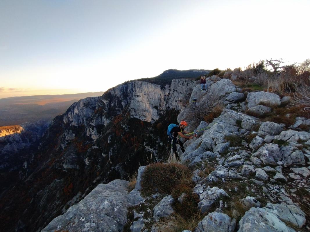 Secteur Escalès. Rappels juste à côté du parking du belvédère à flan de falaise. 2 rappels pour atteindre "le Jardin", puis 2 autres pour arriver au pied de la face.